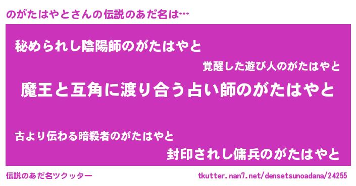 | 男性向けラノベタイトル風あだ名 | 『おまえをオタクにしてやるから、俺をのがたはやとにしてくれ! 』 |