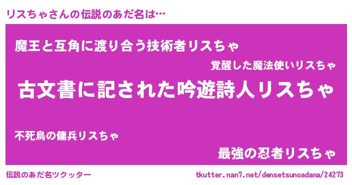 | 男性向けラノベタイトル風あだ名 | 『この素晴らしい世界にリスちゃを!』 |