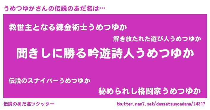 | ヒーロー風カッコイイあだ名 | 『ネオウメツユカ』『魔戒騎士ウメ』 |