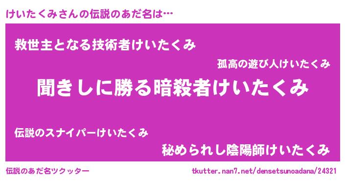 | 男性向けラノベタイトル風あだ名 | 『けいたくみという概念が存在しない退屈な世界 』 |