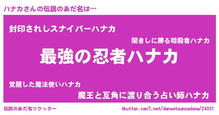 | 男性向けラノベタイトル風あだ名 | 『ハナカに滅ぼされるだけの簡単なお仕事です』 |