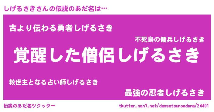 | 男性向けラノベタイトル風あだ名 | 『Re:しげるさきから始める異世界生活』 |
