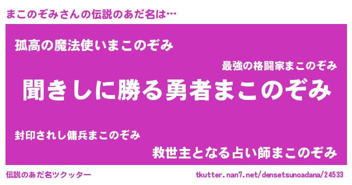 | 女子向けラノベタイトル風あだ名 | 『異世界で失敗しない100のまこのぞみ』 |