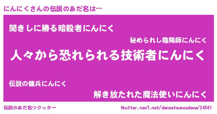 | 男性向けラノベタイトル風あだ名 | 『おまえをオタクにしてやるから、俺をにんにくにしてくれ! 』 |