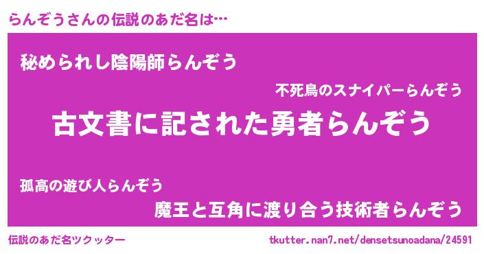 | 男性向けラノベタイトル風あだ名 | 『らんぞうに滅ぼされるだけの簡単なお仕事です』 |