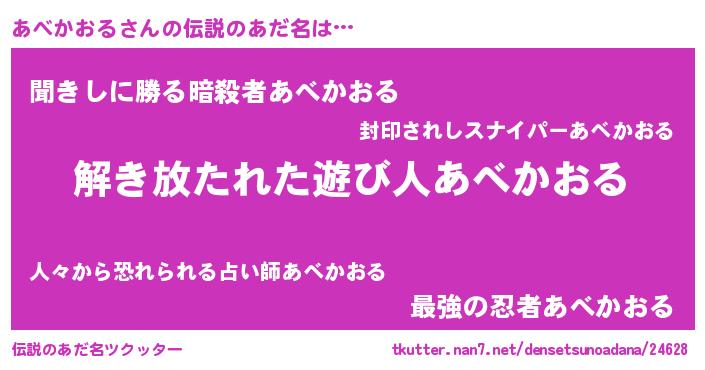 | 男性向けラノベタイトル風あだ名 | 『あべかおるに滅ぼされるだけの簡単なお仕事です』 |