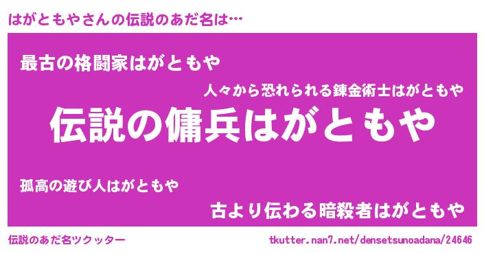 | ファンタジー風あだ名 | 『ハガフェル』『エターナルハガトモヤー』 |