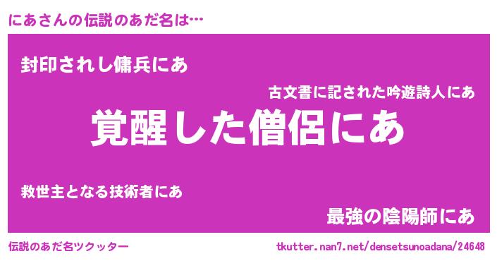| 男性向けラノベタイトル風あだ名 | 『この素晴らしい世界ににあを!』 |