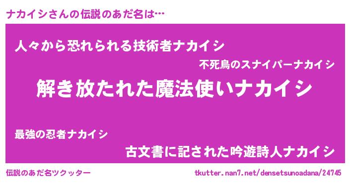 | 男性向けラノベタイトル風あだ名 | 『転生したらナカイシだった件』 |