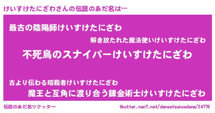 | 男性向けラノベタイトル風あだ名 | 『けいすけたにざわに滅ぼされるだけの簡単なお仕事です』 |