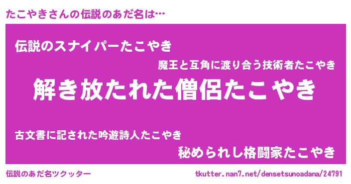 | 男性向けラノベタイトル風あだ名 | 『転生したらたこやきだった件』 |