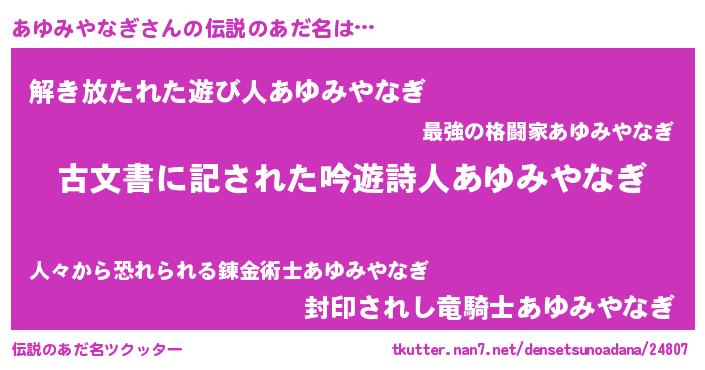 | ヘコむあだ名 | 『あゆみやなぎ(笑)』『あゆ太郎』 |