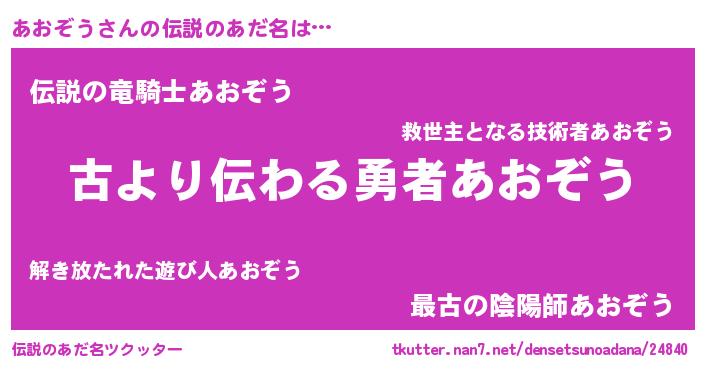 | 男性向けラノベタイトル風あだ名 | 『あおぞうに滅ぼされるだけの簡単なお仕事です』 |