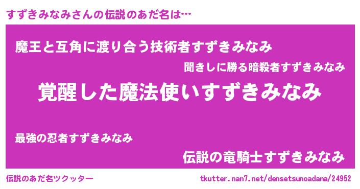 | 男性向けラノベタイトル風あだ名 | 『すずきみなみの嫁は女の子じゃないと思った?』 |