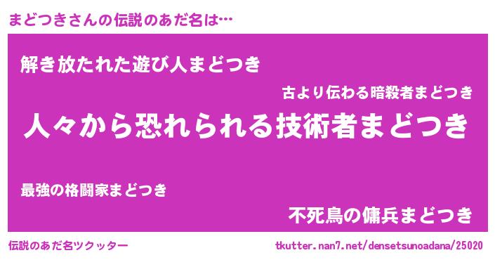 | 意味不明あだ名 | 『自称まどつき』『なめこ科まどつき属』 |