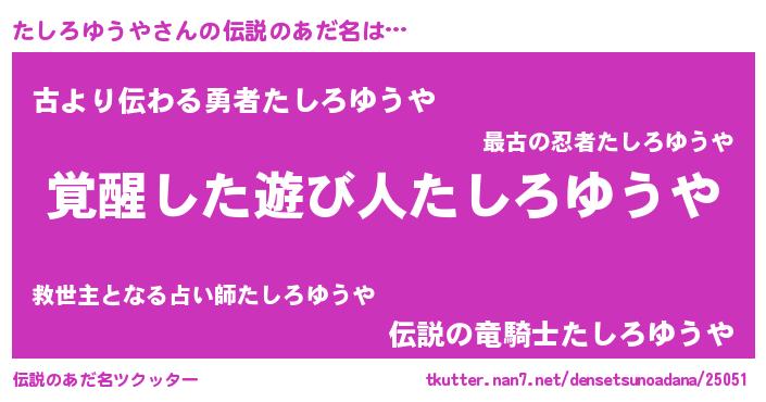 | 男性向けラノベタイトル風あだ名 | 『たしろゆうや~年齢イコール彼女いない歴の魔法使い~』 |