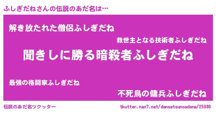 | 意味不明あだ名 | 『自称ふしぎだね』『永久保存ふしぎだね』 |
