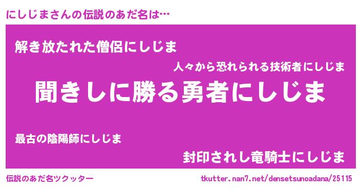 | 男性向けラノベタイトル風あだ名 | 『ニシジマスレイヤー』 |