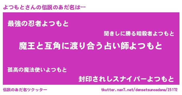| ヒーロー風カッコイイあだ名 | 『慈愛の使者よつもと』『仮面ヨツダー』 |