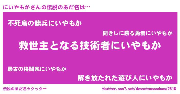 | ヒーロー風カッコイイあだ名 | 『天空の使者にいやもか』『炎刃騎士ニイ』 |