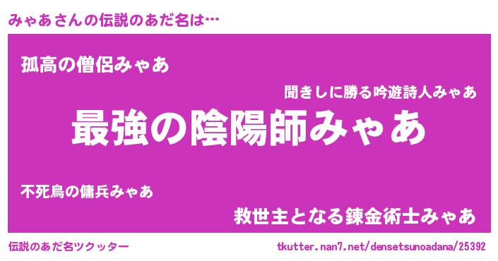 | 男性向けラノベタイトル風あだ名 | 『みゃあ~年齢イコール彼女いない歴の魔法使い~』 |