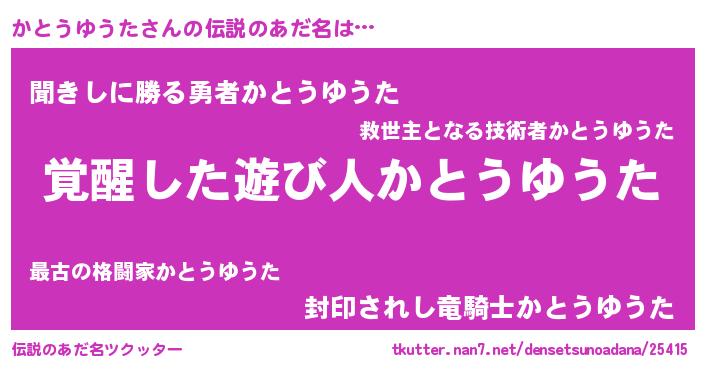 | 男性向けラノベタイトル風あだ名 | 『かとうゆうた~年齢イコール彼女いない歴の魔法使い~』 |