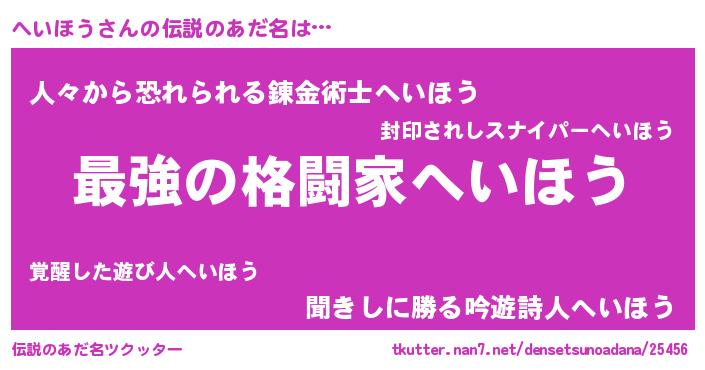| 男性向けラノベタイトル風あだ名 | 『Re:へいほうから始める異世界生活』 |