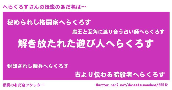 | 男性向けラノベタイトル風あだ名 | 『ダンジョンにへらくろすを求めるのは間違っているだろうか』 |