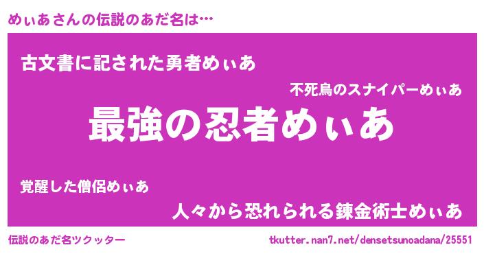 | 男性向けラノベタイトル風あだ名 | 『めぃあ~年齢イコール彼女いない歴の魔法使い~』 |
