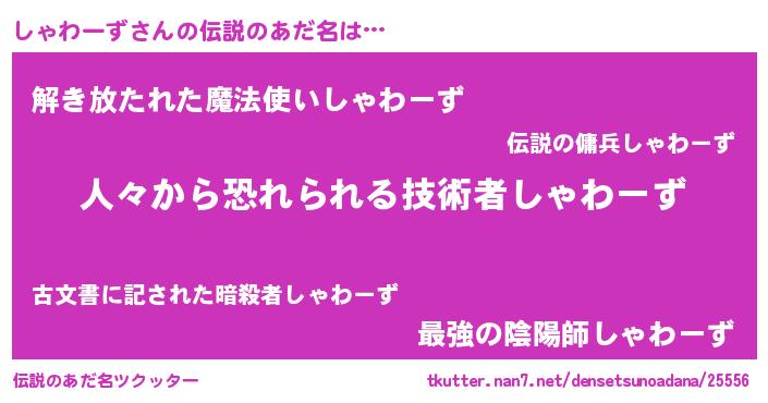 | 男性向けラノベタイトル風あだ名 | 『おまえをオタクにしてやるから、俺をしゃわーずにしてくれ! 』 |