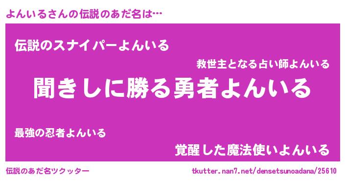 | 意味不明あだ名 | 『自称よんいる』『永久保存よんいる』 |
