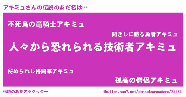 | 男性向けラノベタイトル風あだ名 | 『魔弾の王とアキミュ』『アキミュの憂鬱』 |