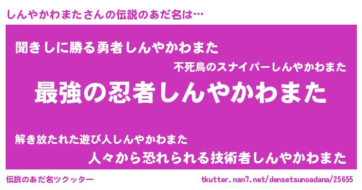 | 男性向けラノベタイトル風あだ名 | 『しんやかわまたに滅ぼされるだけの簡単なお仕事です』 |