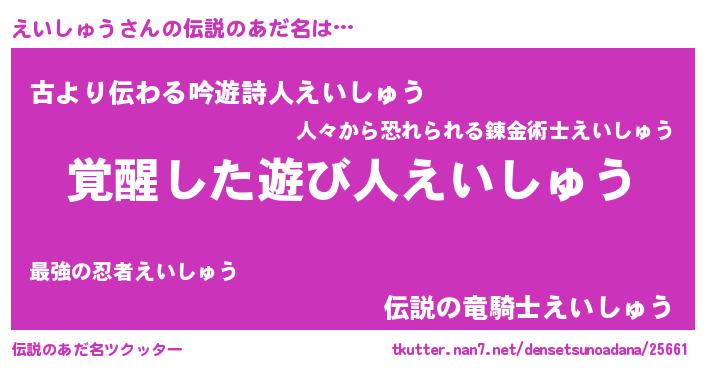 | ヒーロー風カッコイイあだ名 | 『天弓騎士エイ』『ネオエイシュウ』 |