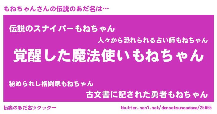 | 男性向けラノベタイトル風あだ名 | 『もねちゃんの嫁は女の子じゃないと思った?』 |