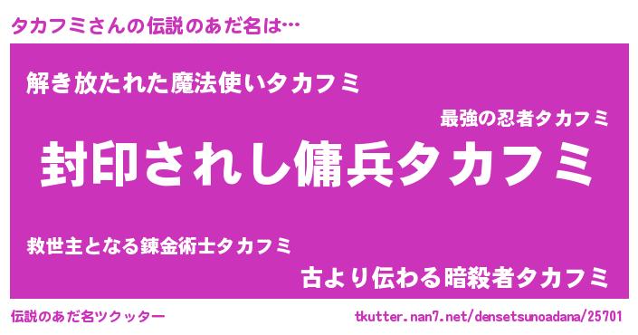 | ヒーロー風カッコイイあだ名 | 『仮面タカダー』『スーパータカフミ』 |