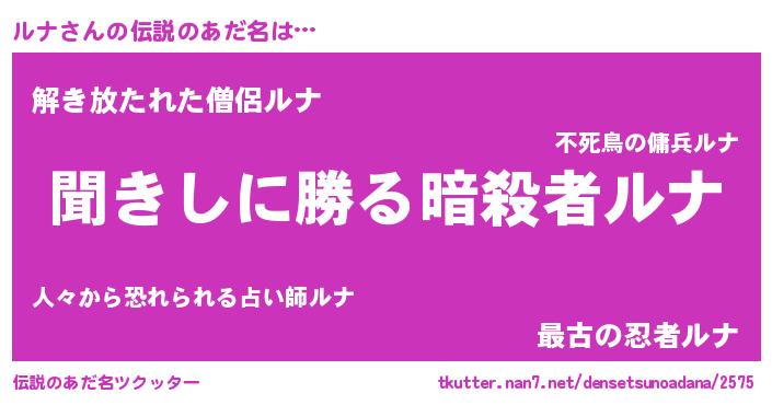 | 女子向けラノベタイトル風あだ名 | 『異世界で失敗しない100のルナ』 |
