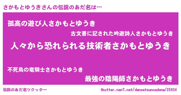 | 女子向けラノベタイトル風あだ名 | 『さかもとゆうきが死なない童話 林檎のさかもとゆうきの診療簿』 |