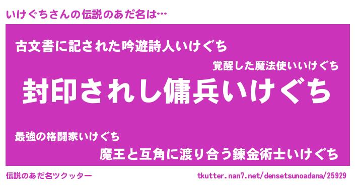 | 男性向けラノベタイトル風あだ名 | 『Re:いけぐちから始める異世界生活』 |