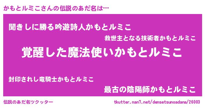 | 男性向けラノベタイトル風あだ名 | 『この素晴らしい世界にかもとルミこを!』 |