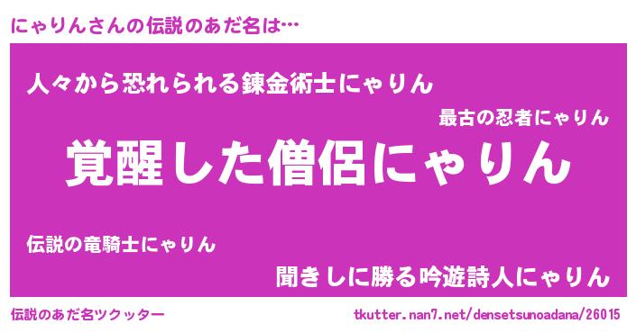 | 男性向けラノベタイトル風あだ名 | 『にゃりん~年齢イコール彼女いない歴の魔法使い~』 |