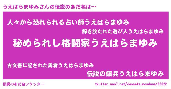 | 男性向けラノベタイトル風あだ名 | 『魔弾の王とうえはらまゆみ』 |
