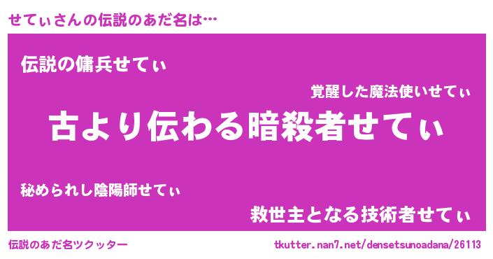 | 男性向けラノベタイトル風あだ名 | 『せてぃという概念が存在しない退屈な世界 』 |