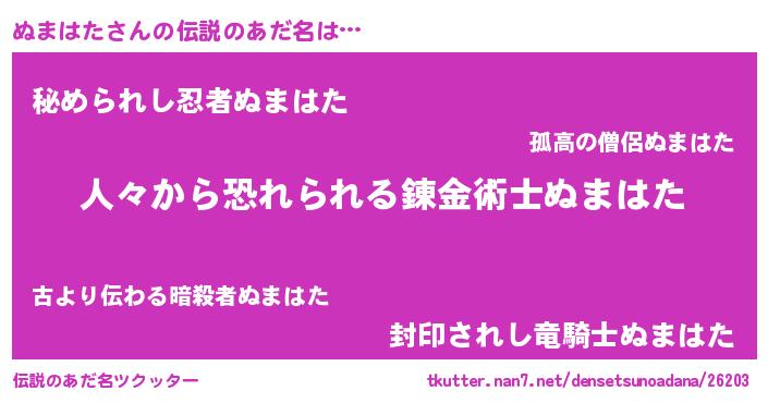 | 男性向けラノベタイトル風あだ名 | 『おまえをオタクにしてやるから、俺をぬまはたにしてくれ! 』 |