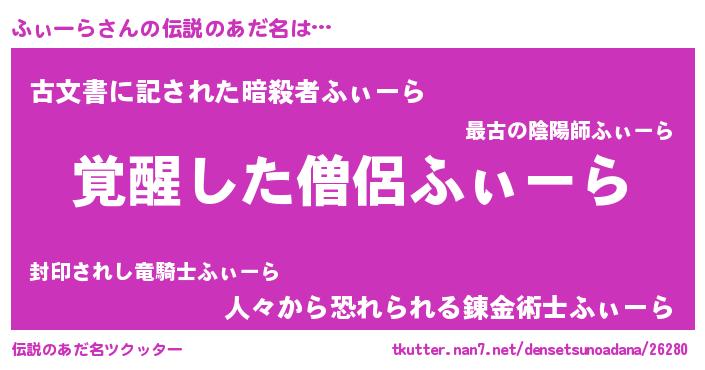 | 男性向けラノベタイトル風あだ名 | 『ふぃーら~年齢イコール彼女いない歴の魔法使い~』 |