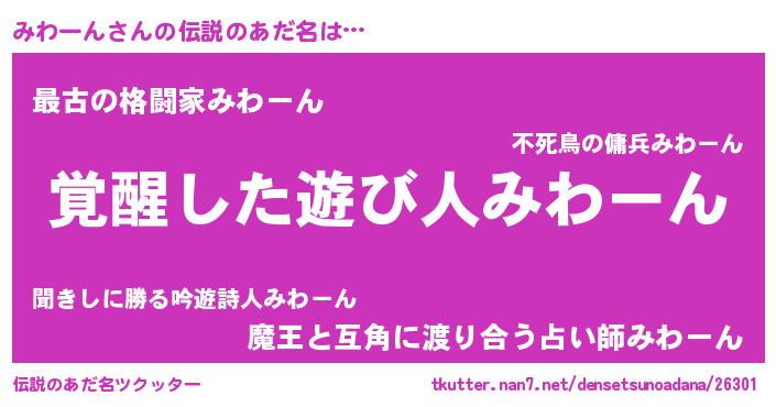 | 男性向けラノベタイトル風あだ名 | 『みわーんの嫁は女の子じゃないと思った?』 |