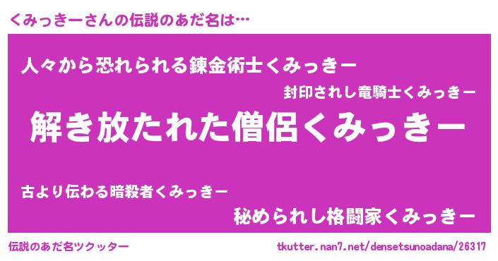 | 男性向けラノベタイトル風あだ名 | 『魔法科高校のくみっきー』 |