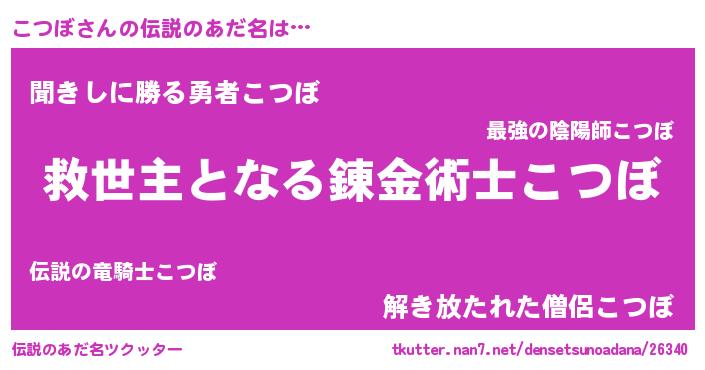 | ヒーロー風カッコイイあだ名 | 『慈愛の使者こつぼ』『ネオコツボ』 |