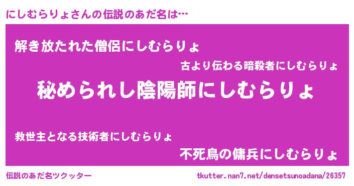 | 男性向けラノベタイトル風あだ名 | 『やはりにしむらりょの青春ラブコメはまちがっている 』 |