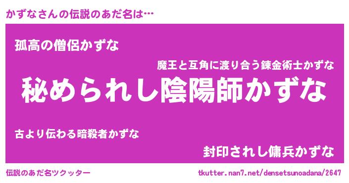 | 男性向けラノベタイトル風あだ名 | 『カズナスレイヤー』 |